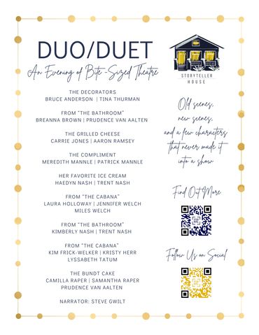 Join us for Duo/Duet, An(other) Night of Bite-Sized Theatre, featuring original scenes and beloved local actors. Ten-minute original scenes in an intimate blackbox theatre. Be in the room where it happens.